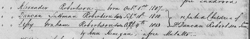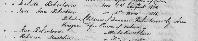 Duncan Robertson ('junior')(1781 - 1850) had several children with Ann Henegan. Ann was described in the registers as a 'free mulatto' and later as a 'free person of colour'.