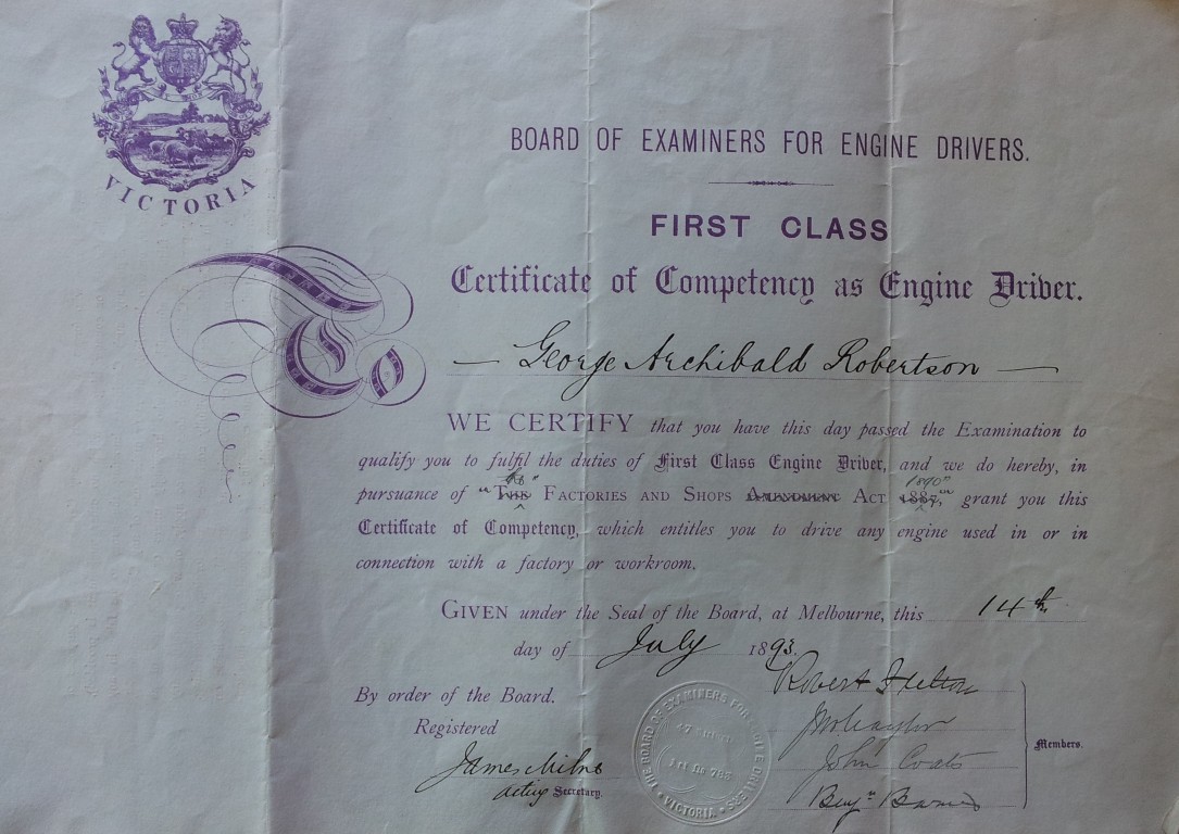 George received a certificate as a First Class Engine Driver on 14 July 1893 at the age of 25.
